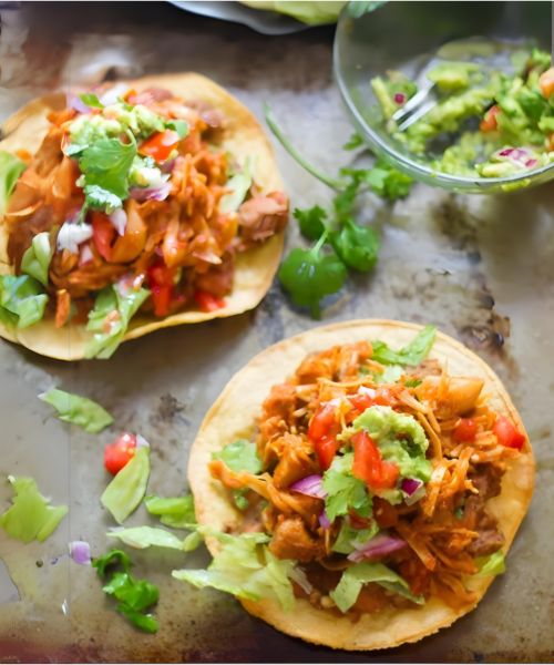 "Descubre el deleite de cada bocado con estas tostadas de tinga, reinventadas con la suculenta yaca que le otorga un toque único y sabroso, ¡una experiencia que no querrás perderte!"