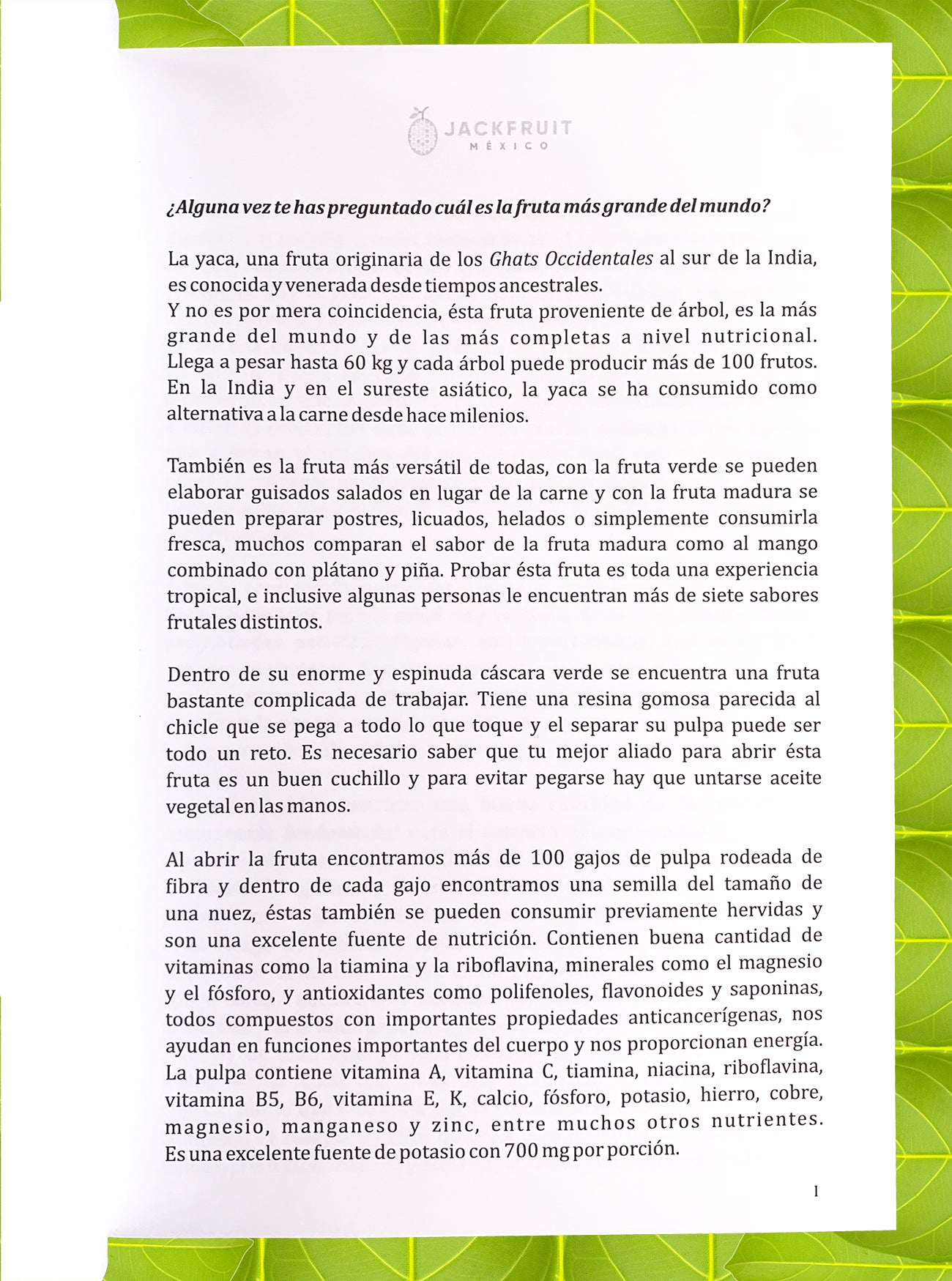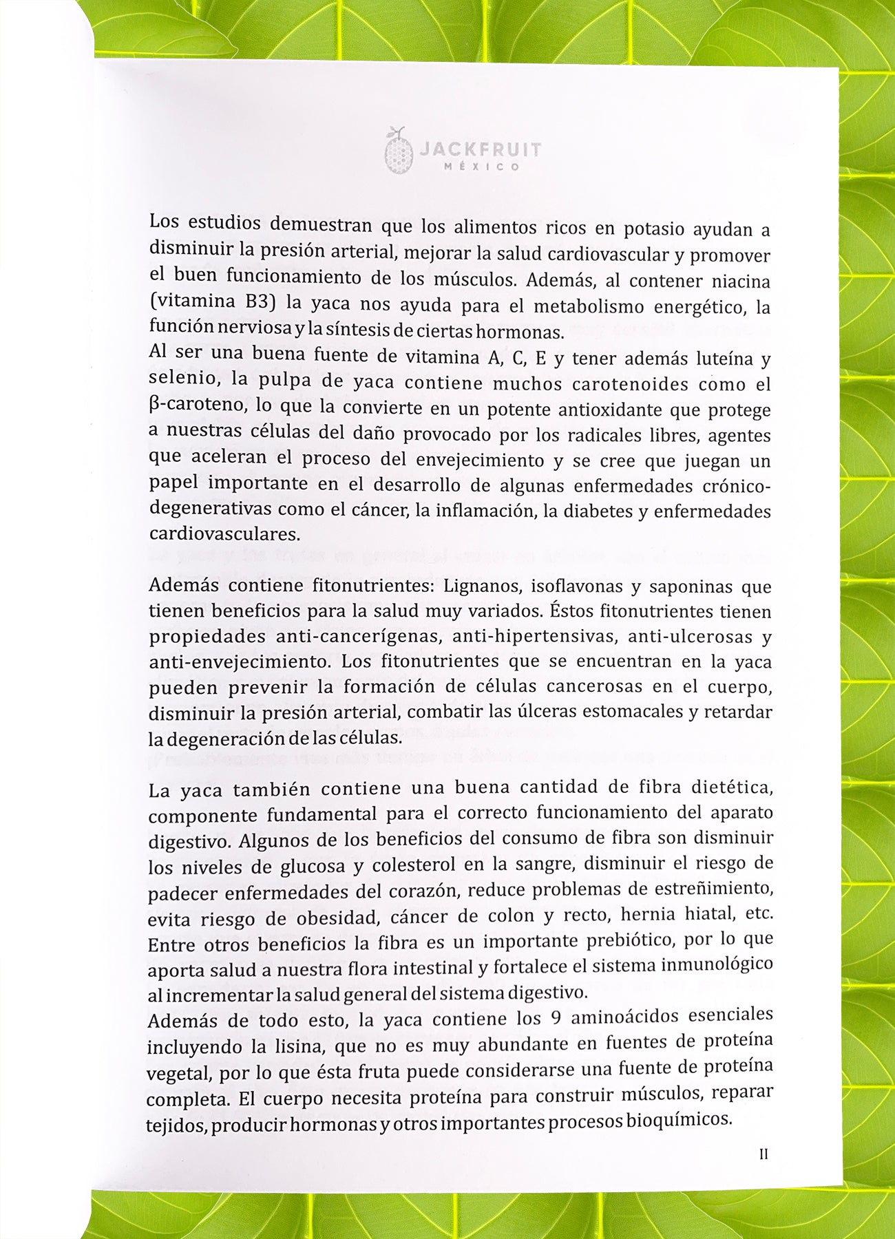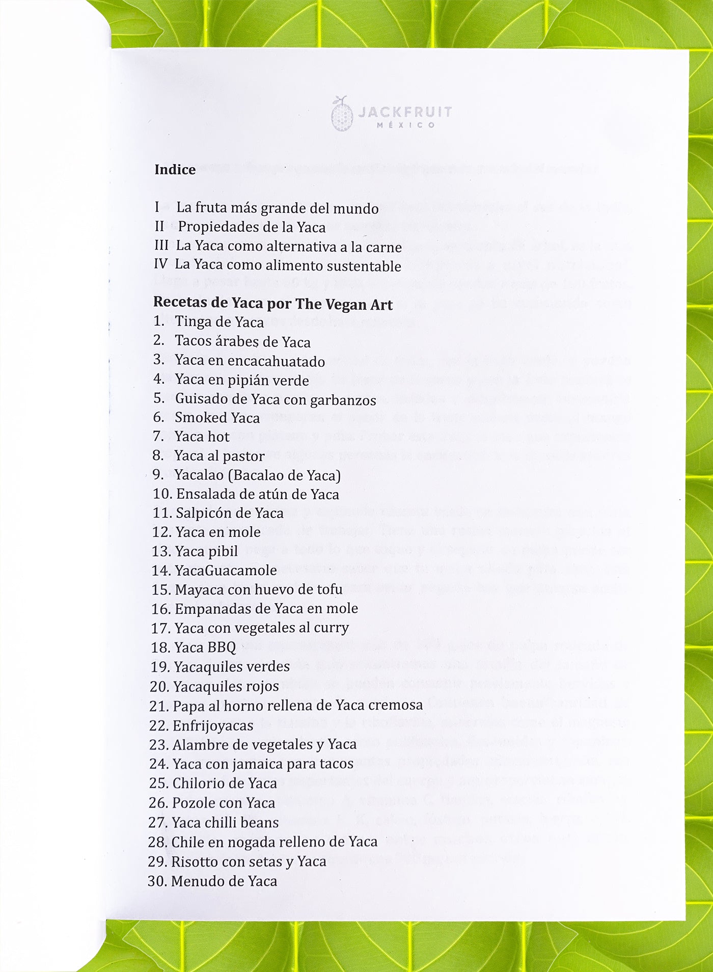 En este recetario se plasma la recopilación más extensa de recetas con yaca en México. Realizadas por una extraordinaria cocinera poblana, con 37 años sin comer ningún ingrediente de origen animal, logra transmitir de una manera simple y práctica el uso de esta fruta como alternativa a la carne.