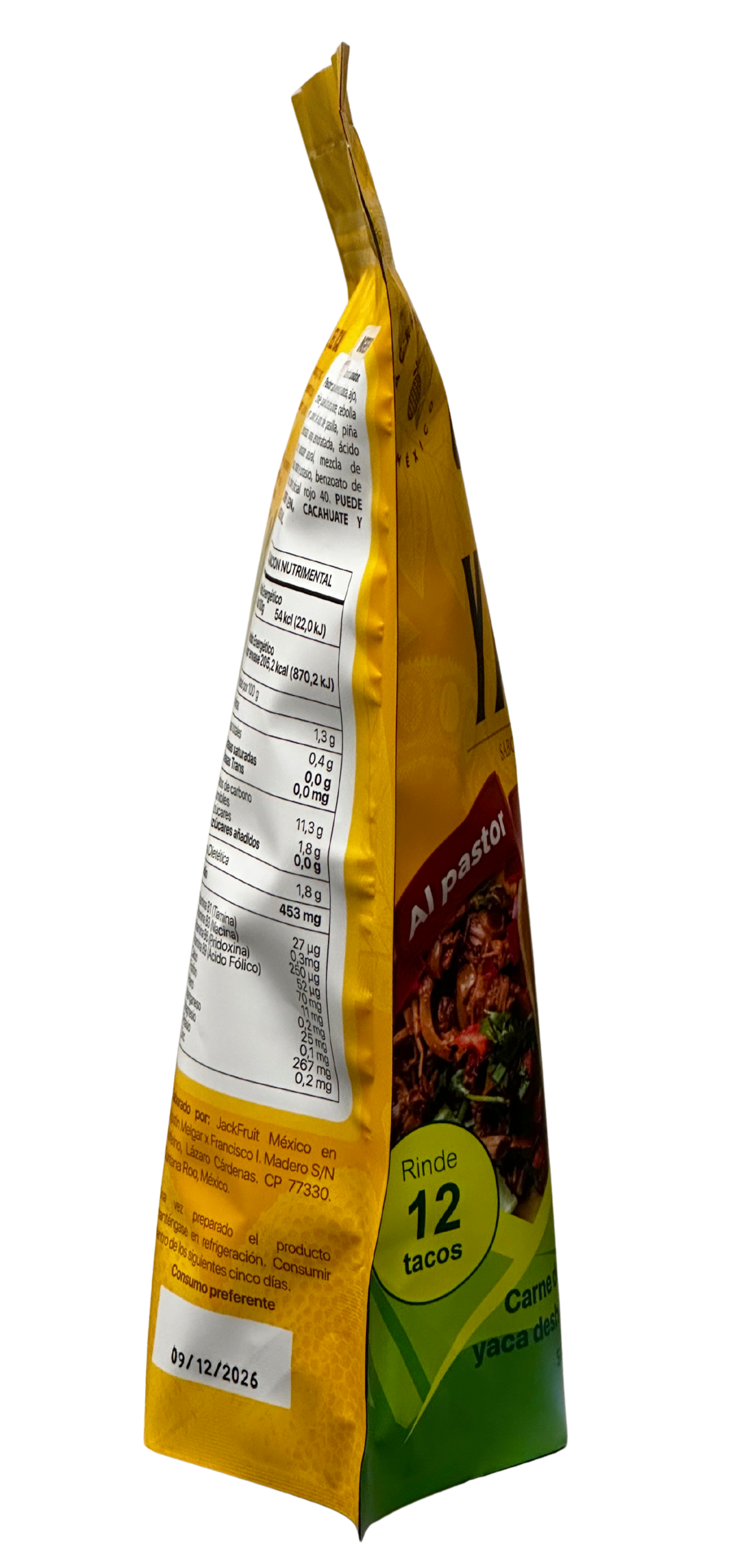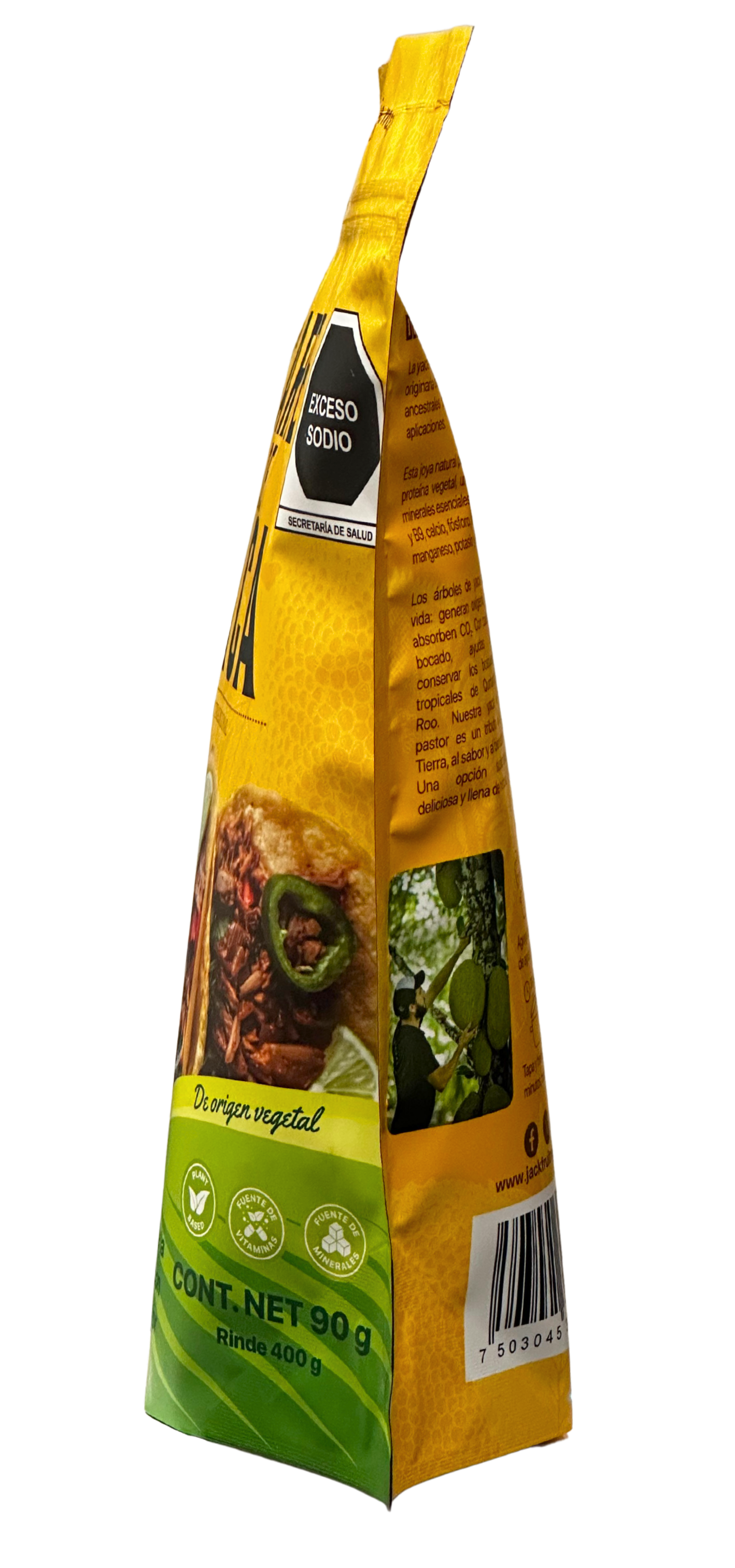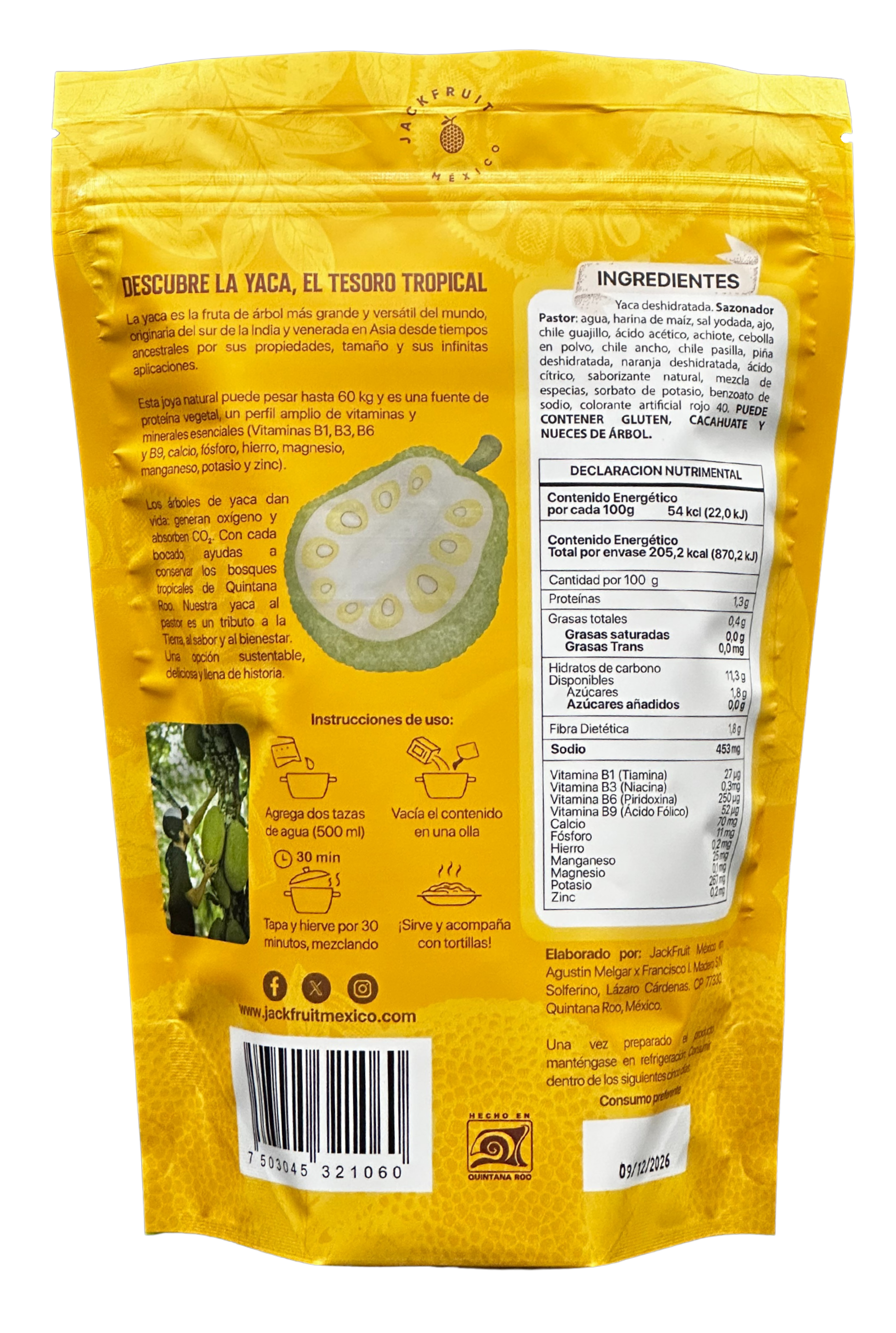 El empaque contiene yaca deshidratada integrado con la receta especial al pastor en un sobre, lista para cocinar sin necesidad de añadir nada más.