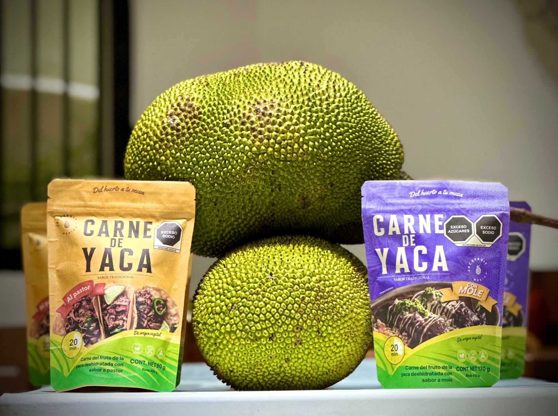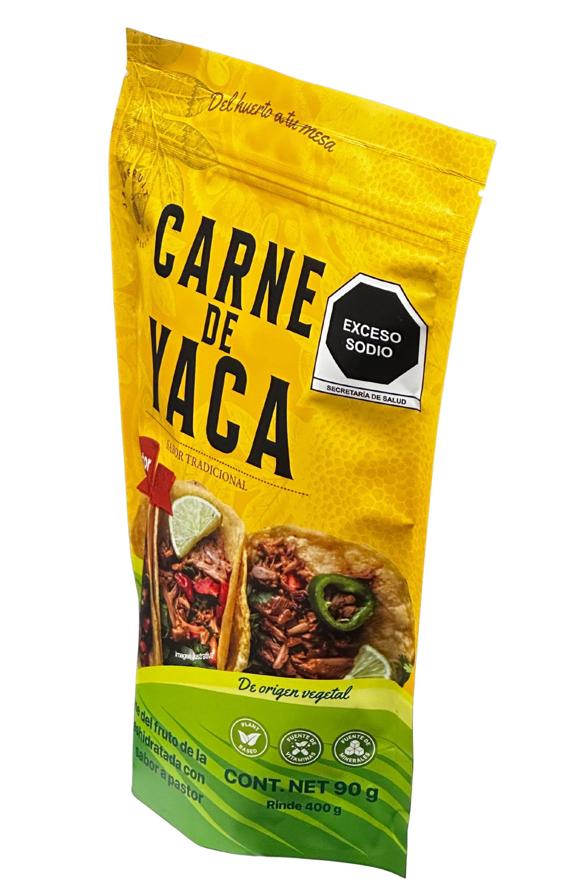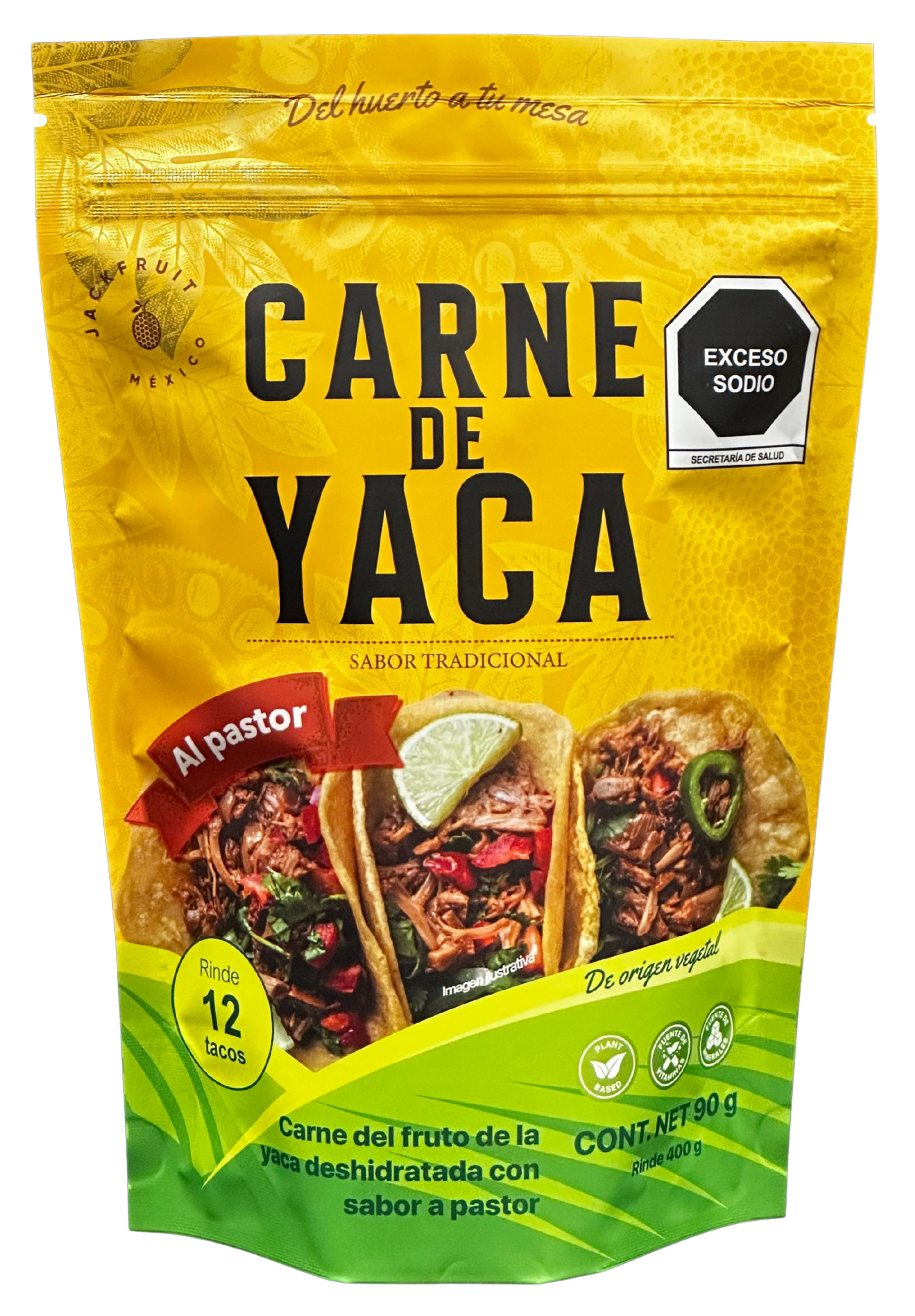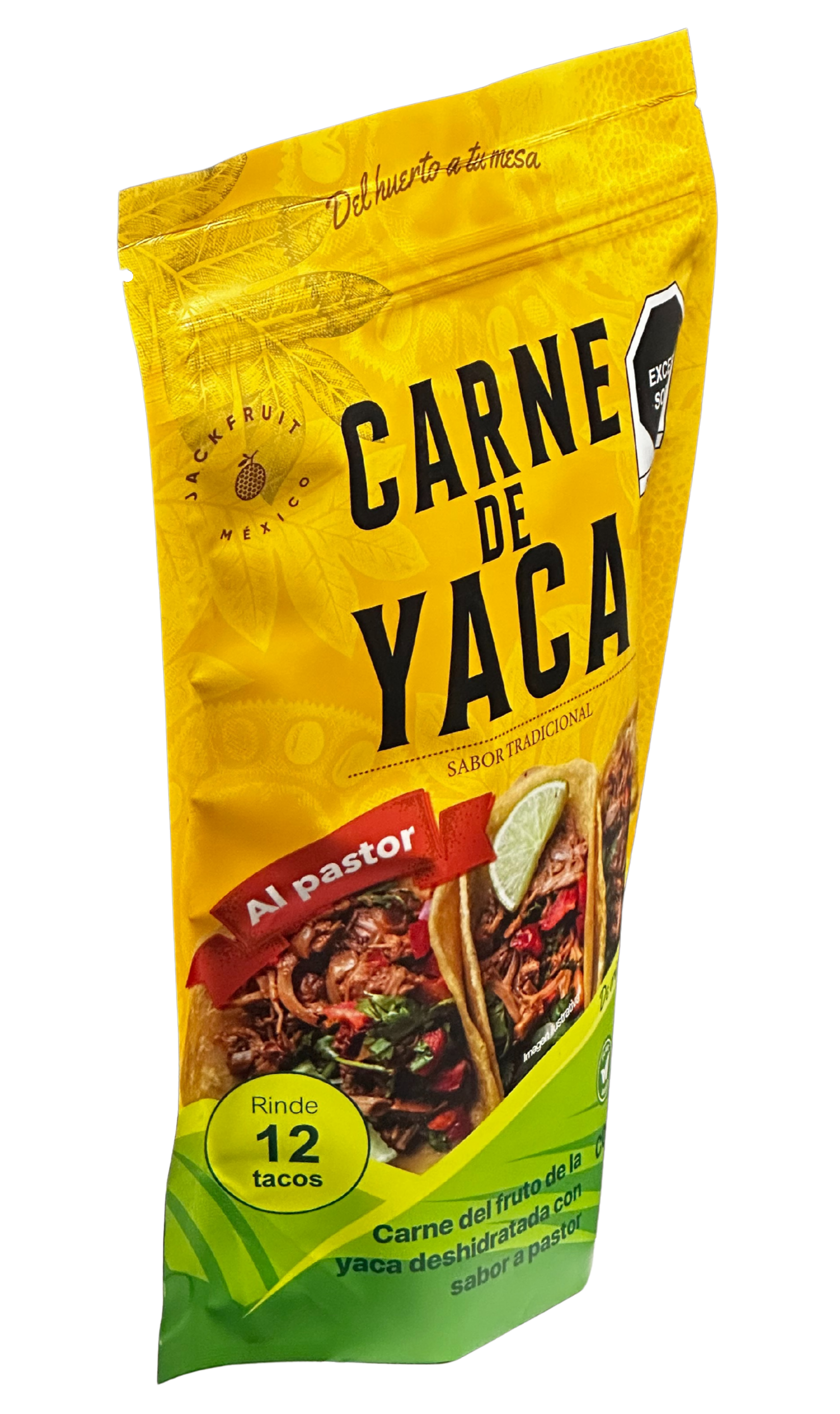 El empaque contiene yaca deshidratada integrado con la receta especial al pastor en un sobre, lista para cocinar sin necesidad de añadir nada más.